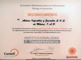 10/11/10 Ciudad de México.- Dentro del marco de la reunión anual del Centro Mexicano para la Filantropía (CEMEFI) Aldeas Infantiles SOS México fue distinguida con la Acreditación de los Indicadores de Institucionalidad y Transparencia los cuales tienen por objetivo aumentar la transparencia y rendición de cuentas de las organizaciones de la sociedad civil de modo que se fomente la confianza de las entidades donantes (empresas, fundaciones y particulares).